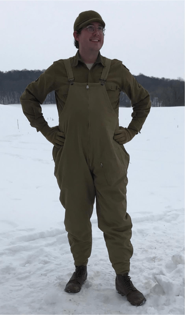 As I’ve been crawling through the 1st Engineer Combat Battalion archives, I discovered that the combat engineers were issued with Trousers, Combat, Winter (aka “the tanker bib”) during the 1943 Tunisian Campaign. By all accounts, the campaign was frightfully cold, and soldiers tried to acquire everything they could find—overcoats, scarves, hats, long underwear—just to keep warm in the desert. In February 1943, they even experienced a snow storm!