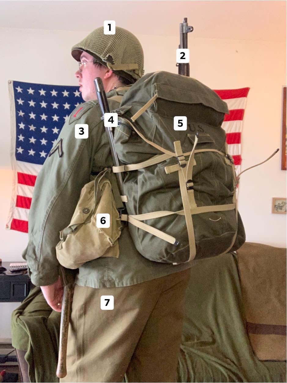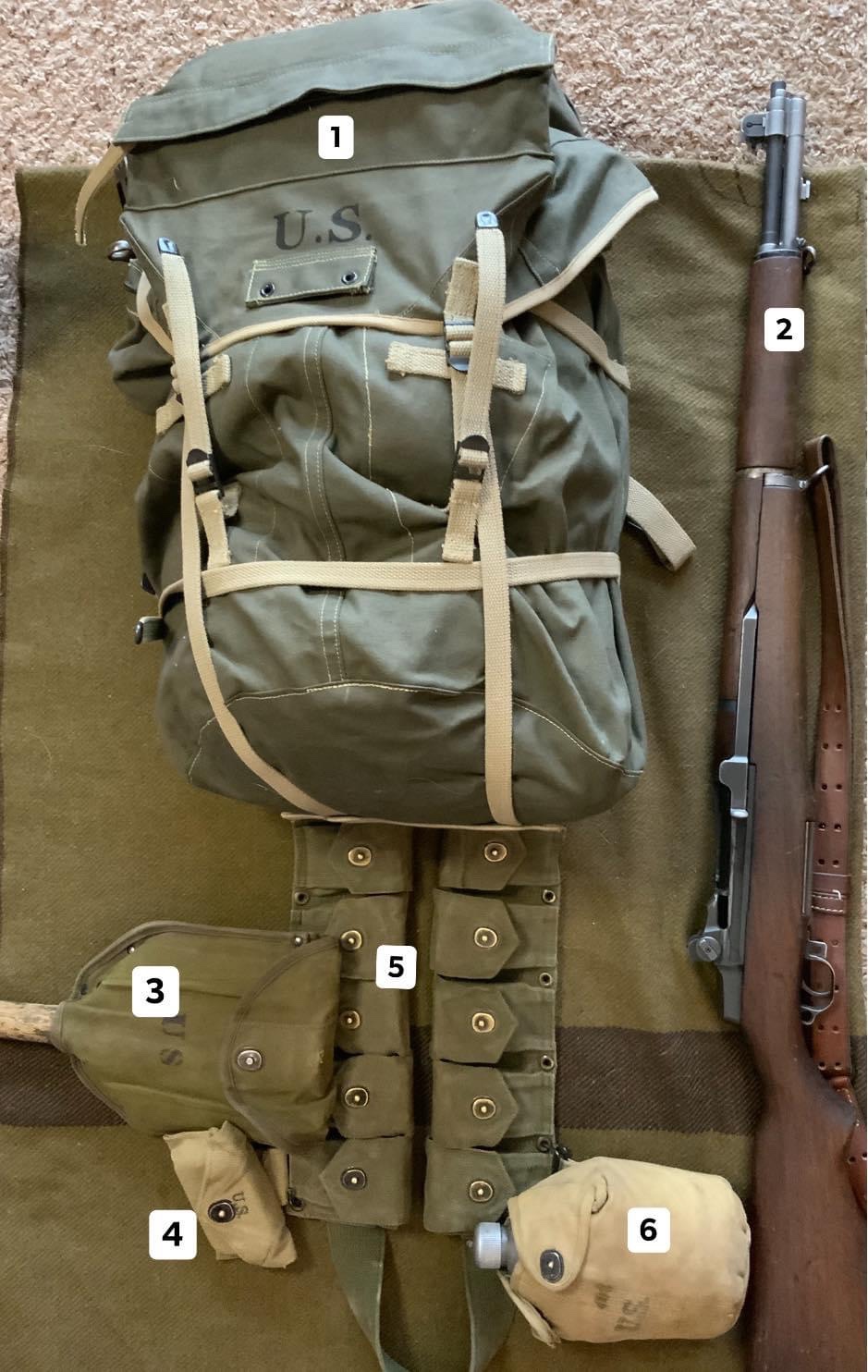 - M6 Gas Mask Bag (the gas mask was “lost” along the way and repurposed to carry hand grenades, a vital weapon for infantrymen)