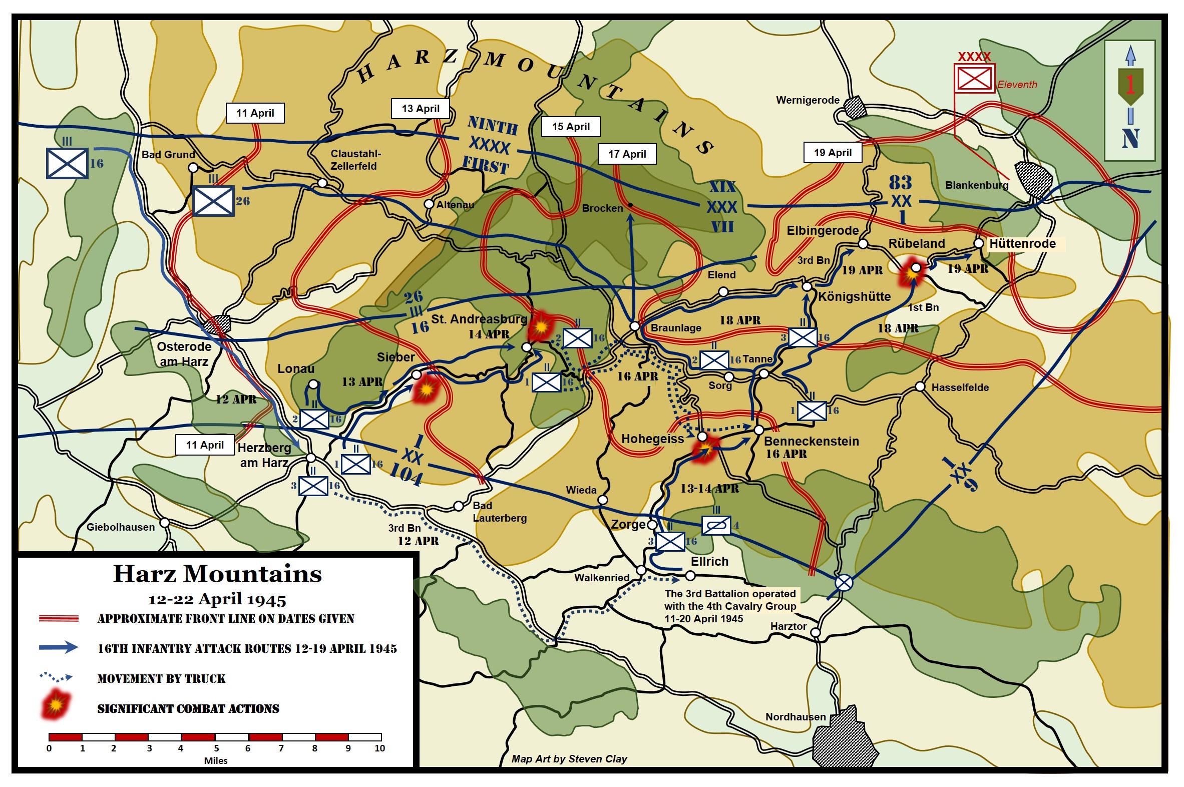 The going was rough. The thick woods of the Harz Mountains restricted vehicles to the roads, meaning that infantrymen had to either assault prepared German positions along the roads or hump their weapons and living supplies through the mountains. Raymond Gattner, who fought with the 16th IR in WWII, described one such trek through the woods in his journal: