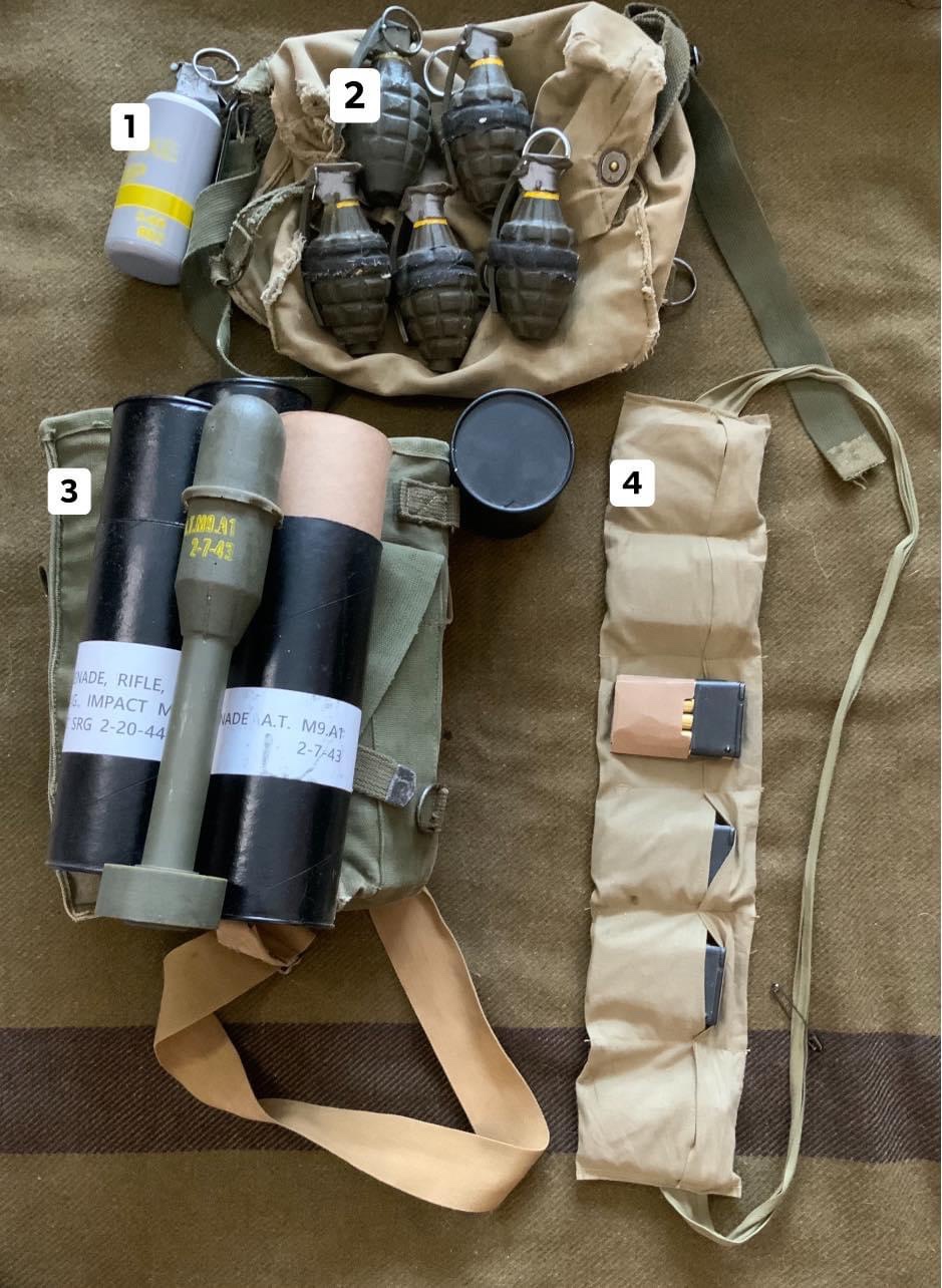 - General Purpose (GP) bag with rifle grenades (typically, infantrymen would carry extra ammo for other men in their unit, so even though I’m not carrying a rifle grenade launcher, I could toss this bag to a buddy who does have one to provide our squad extra firepower)