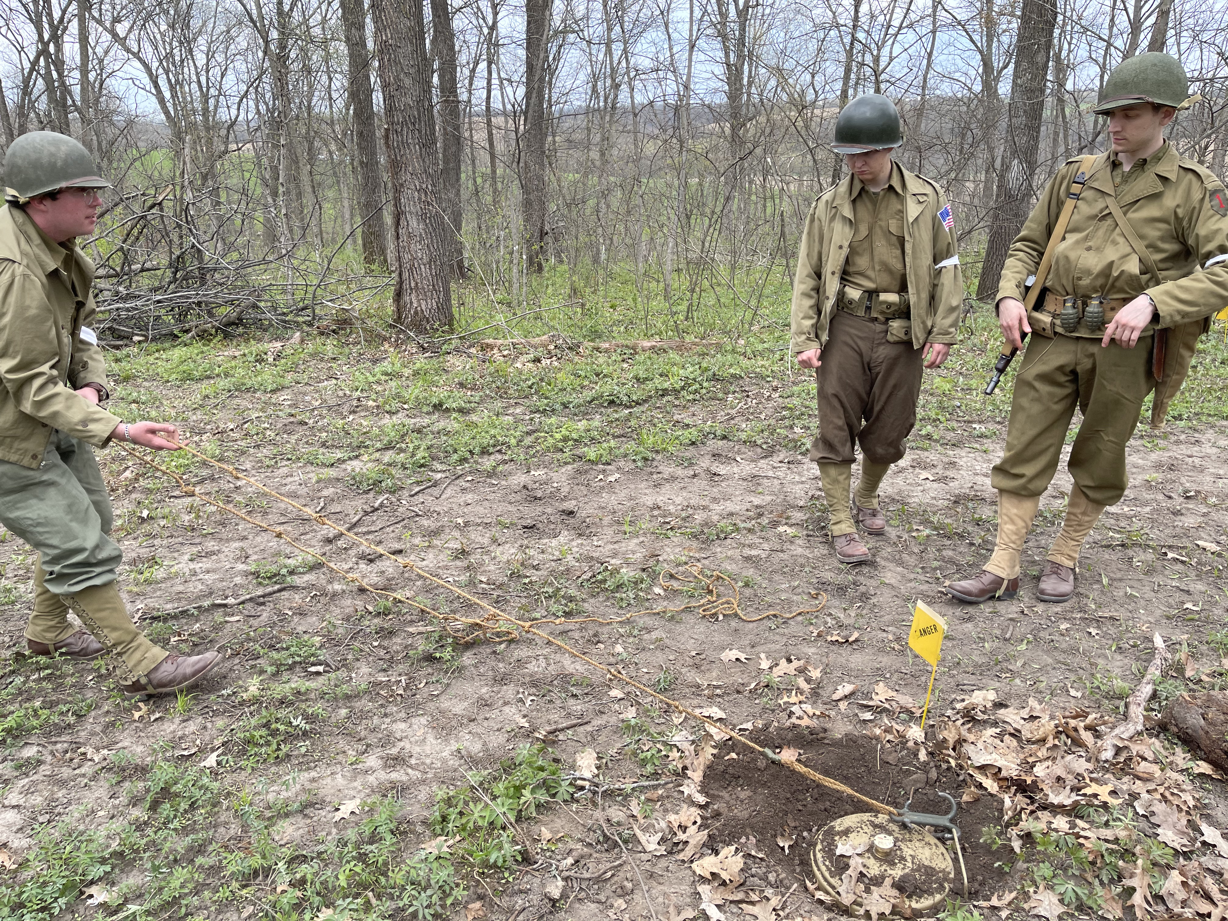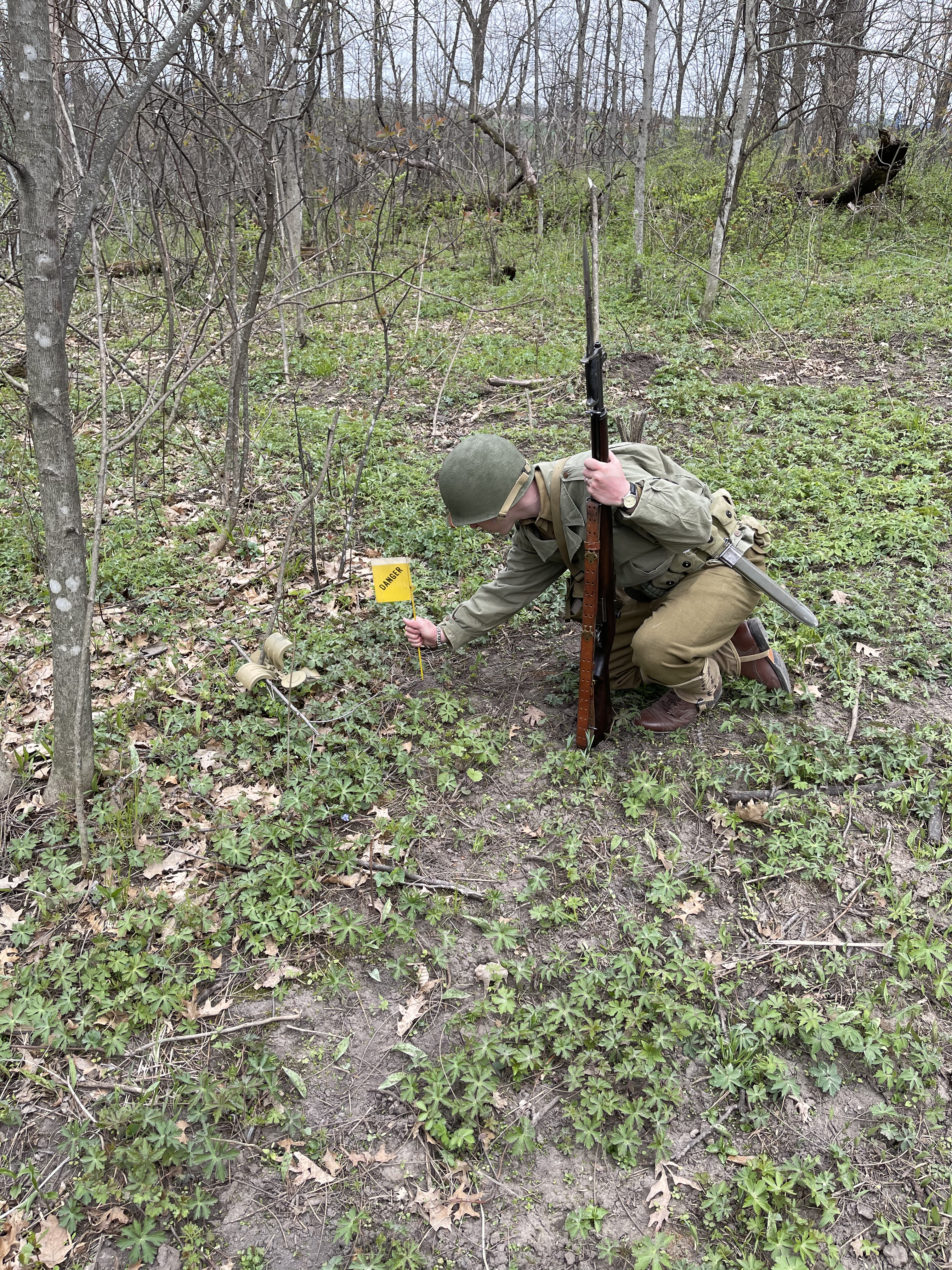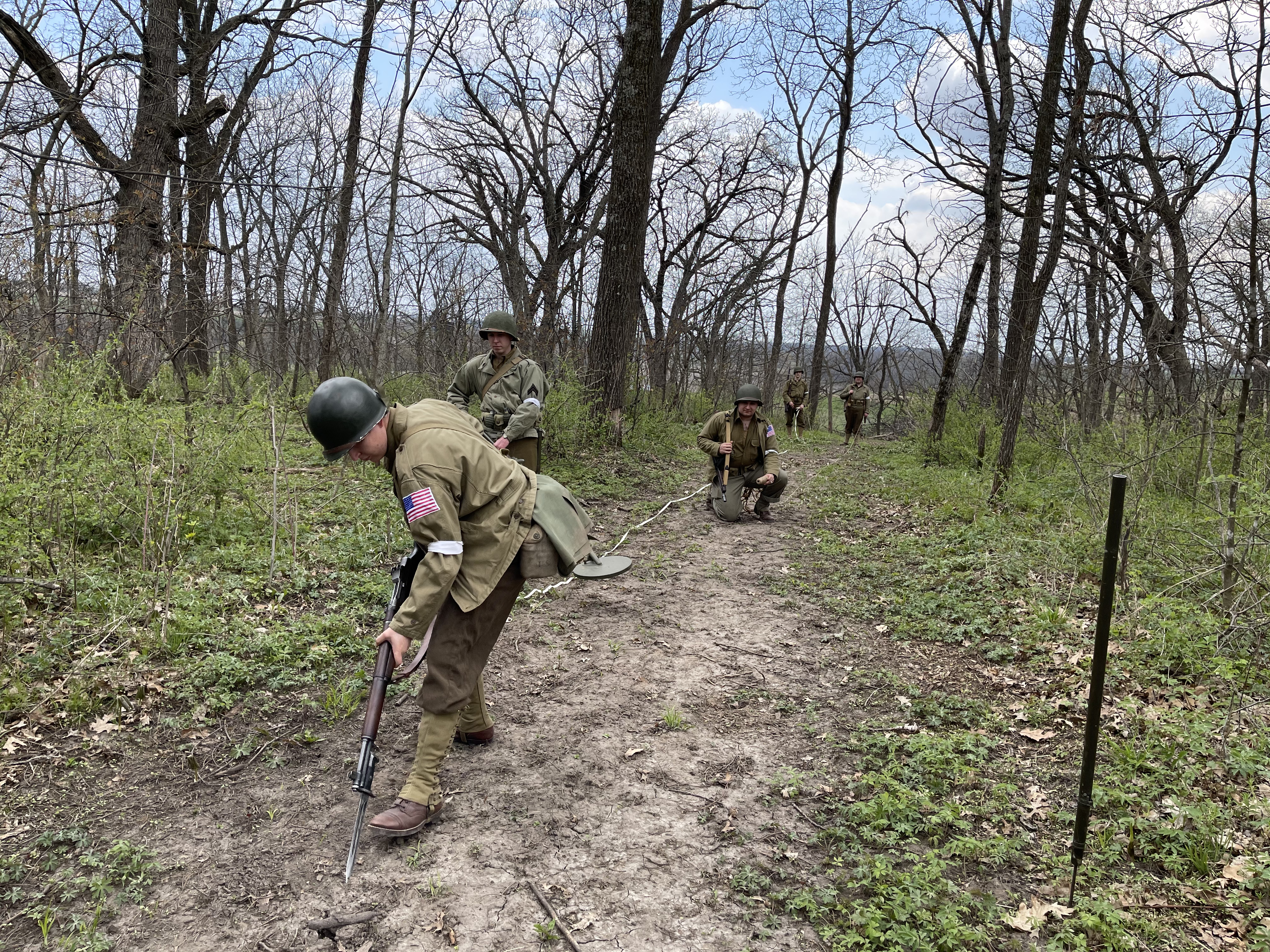 - The “No. 2 man” opened the bag carrying mine markers and white cloth tape, staking the white tape to the beginning of the course. The white tape signals where the party found mines and what kind of mines they found and would be taken with the reconnaissance party back to their base (see the Field Manual above for more information). This allows future engineer teams to study the pattern of the minefield (what kinds of mines they’d be dealing with, what kind of spacing they see between the mines, etc) and help them work faster and safer.