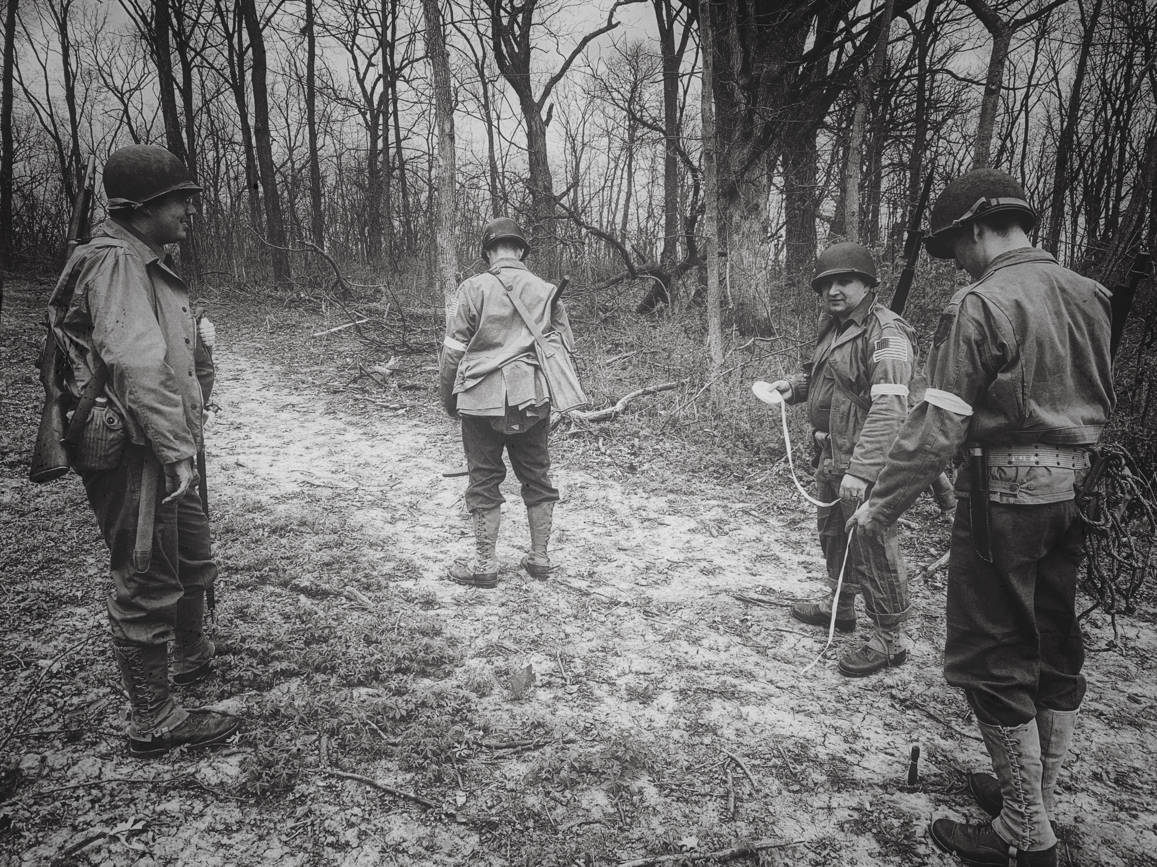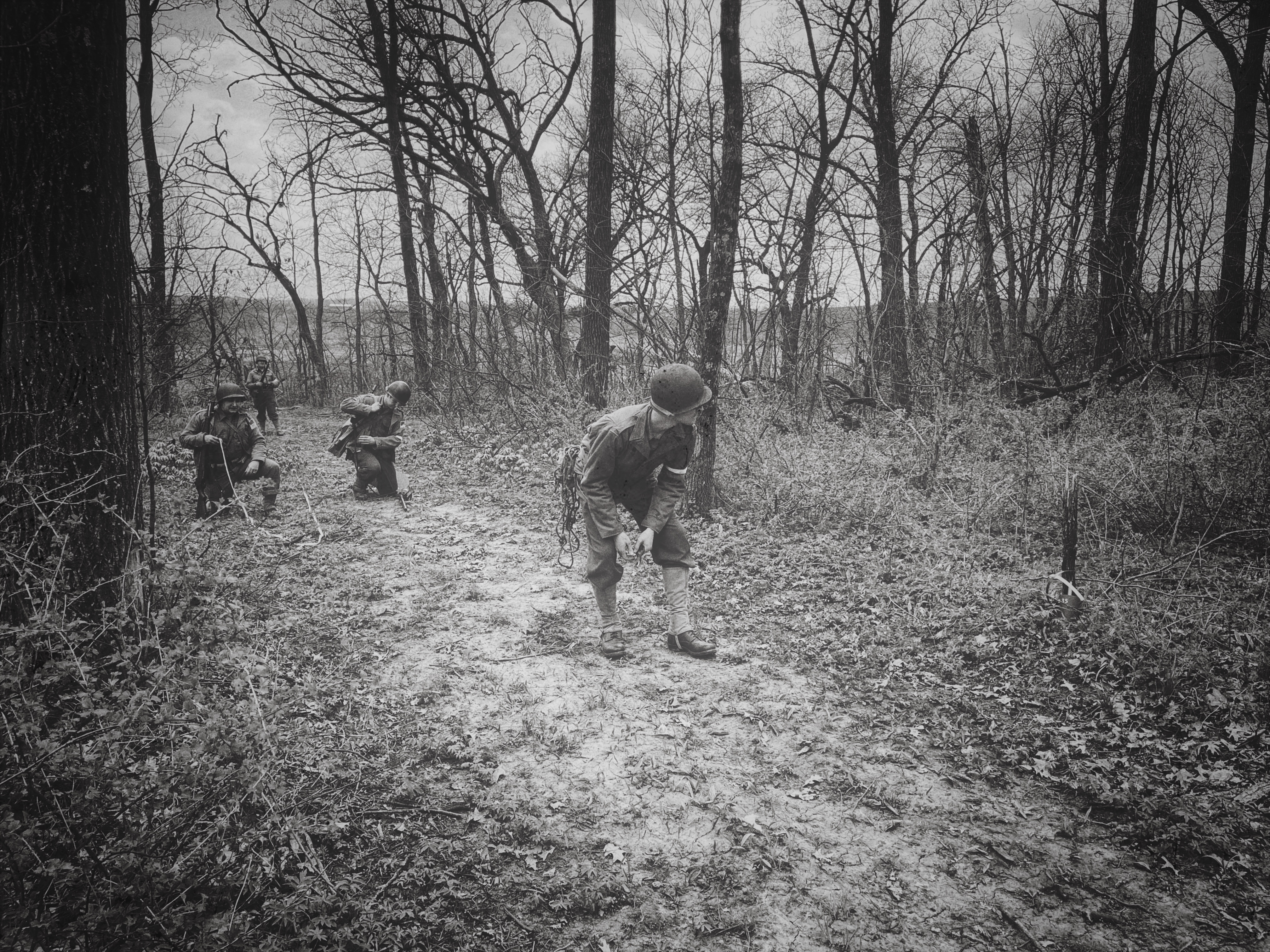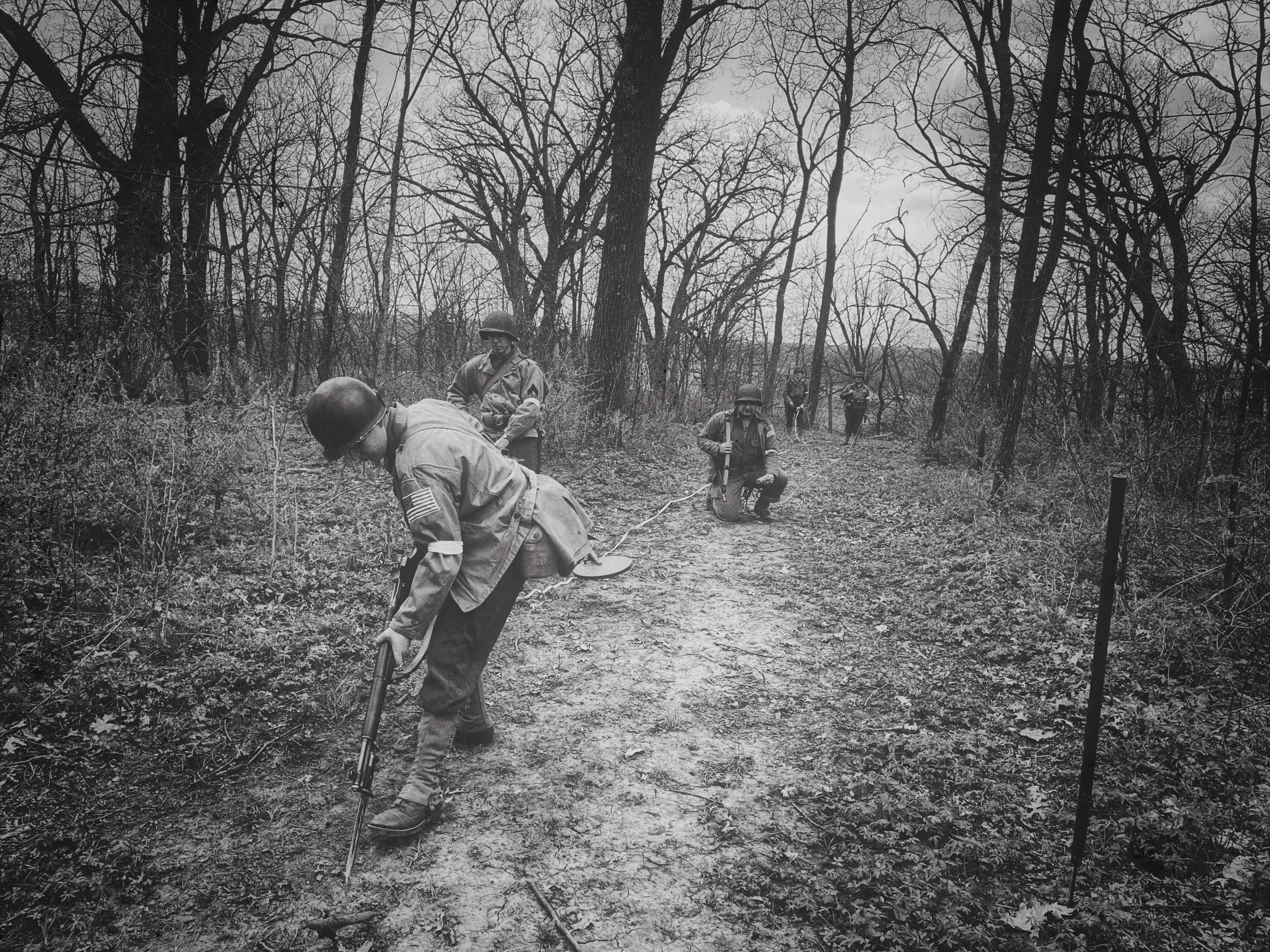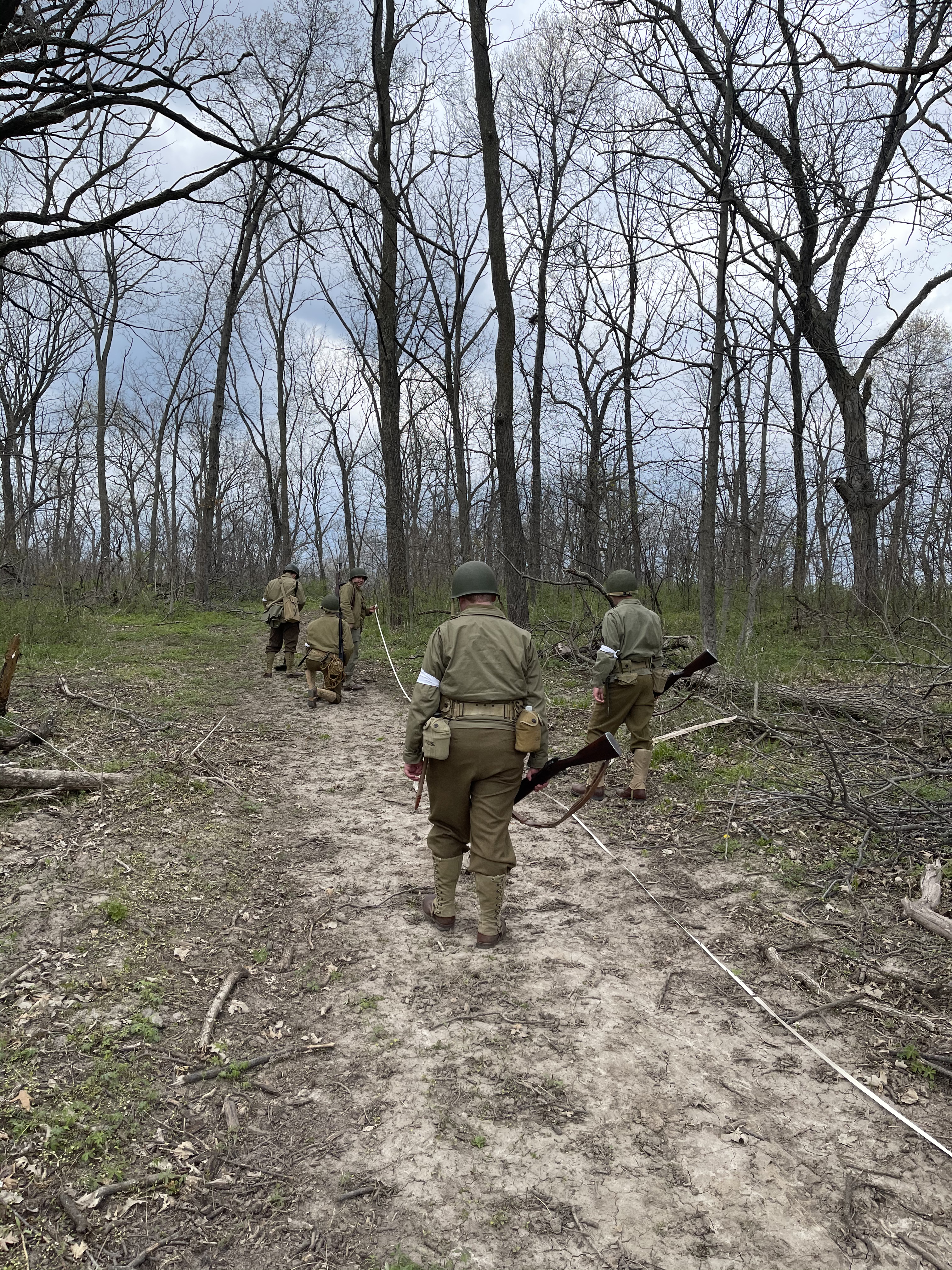 - The “No. 2 man” opened the bag carrying mine markers and white cloth tape, staking the white tape to the beginning of the course. The white tape signals where the party found mines and what kind of mines they found and would be taken with the reconnaissance party back to their base (see the Field Manual above for more information). This allows future engineer teams to study the pattern of the minefield (what kinds of mines they’d be dealing with, what kind of spacing they see between the mines, etc) and help them work faster and safer.