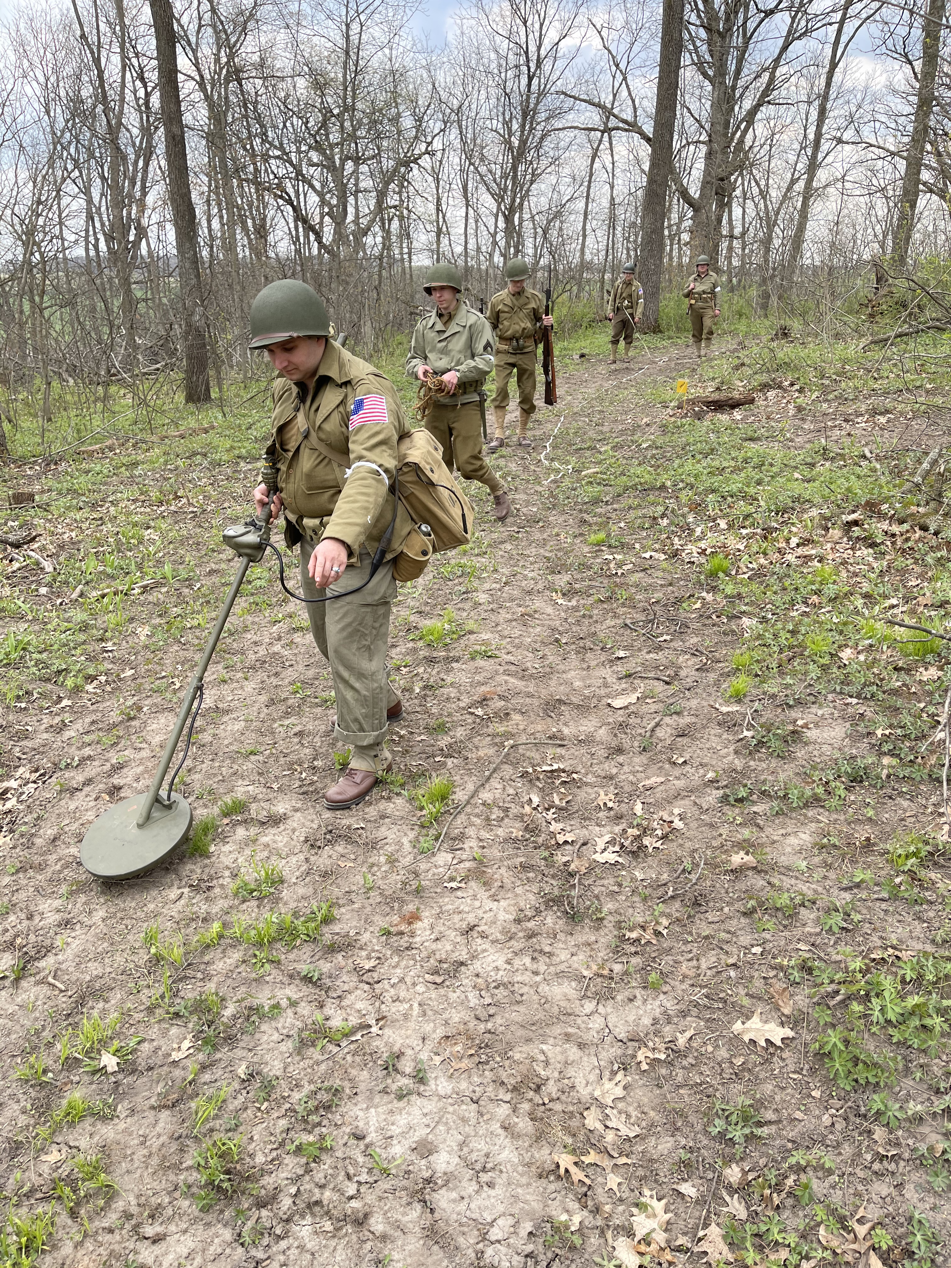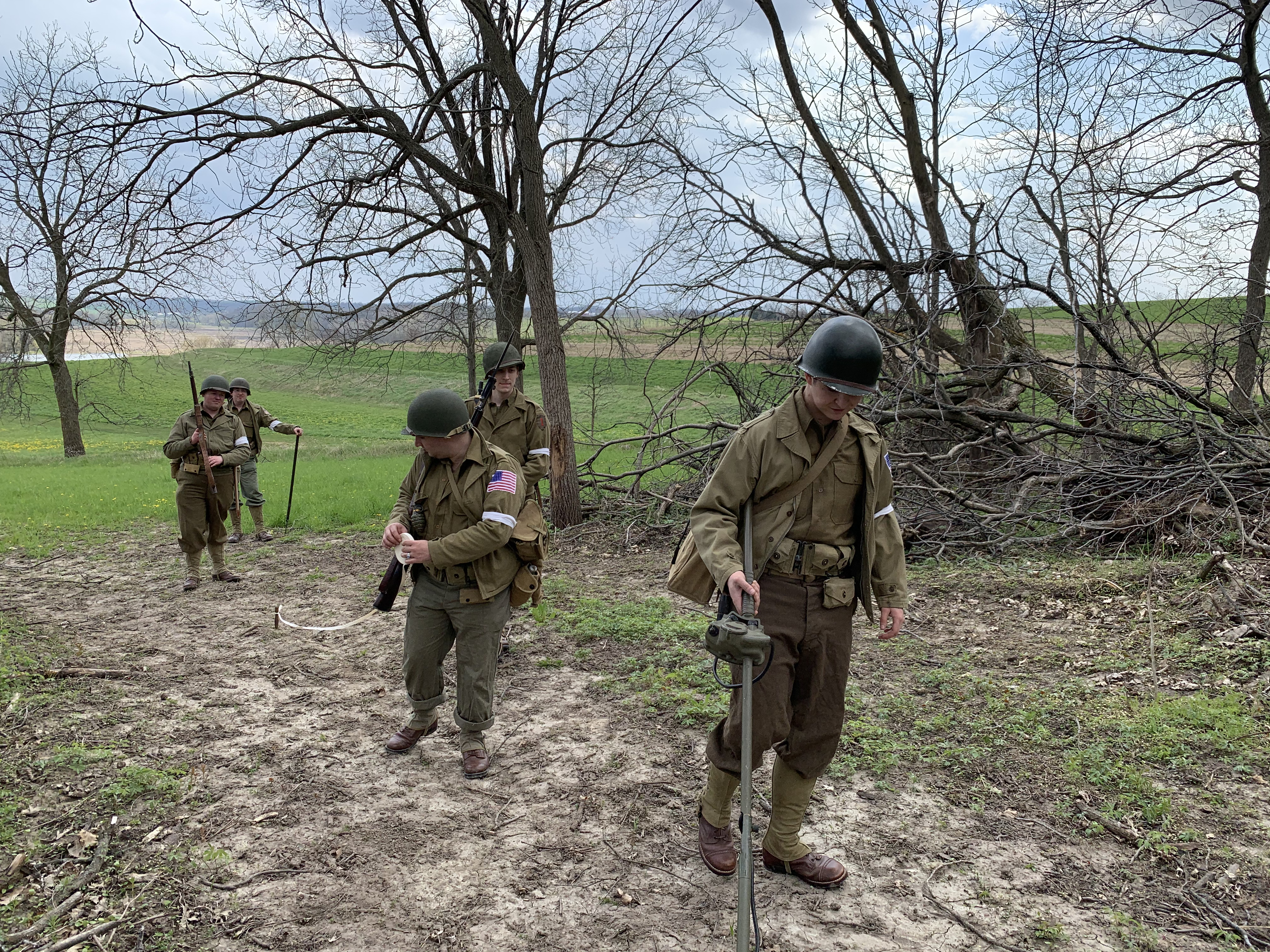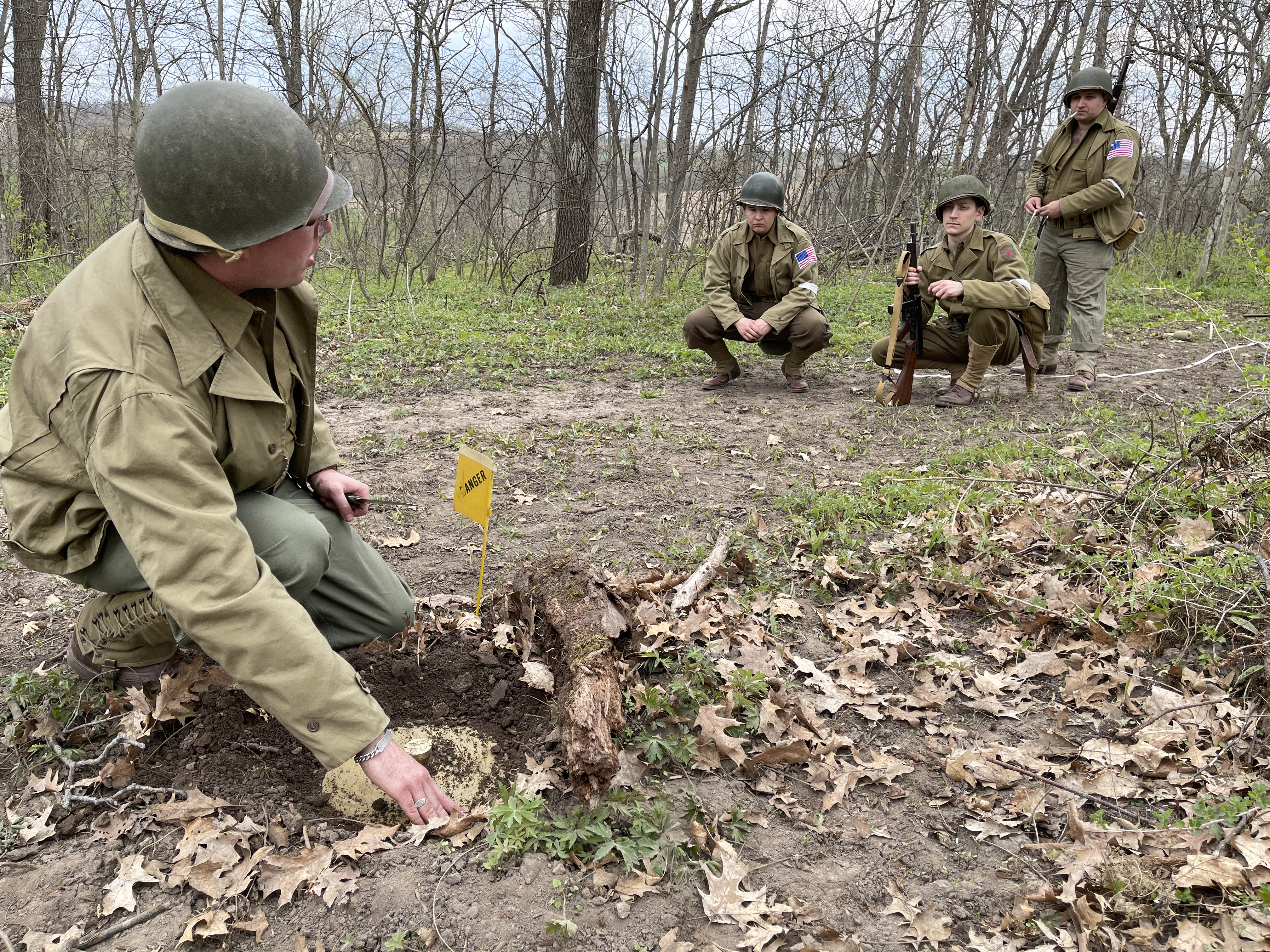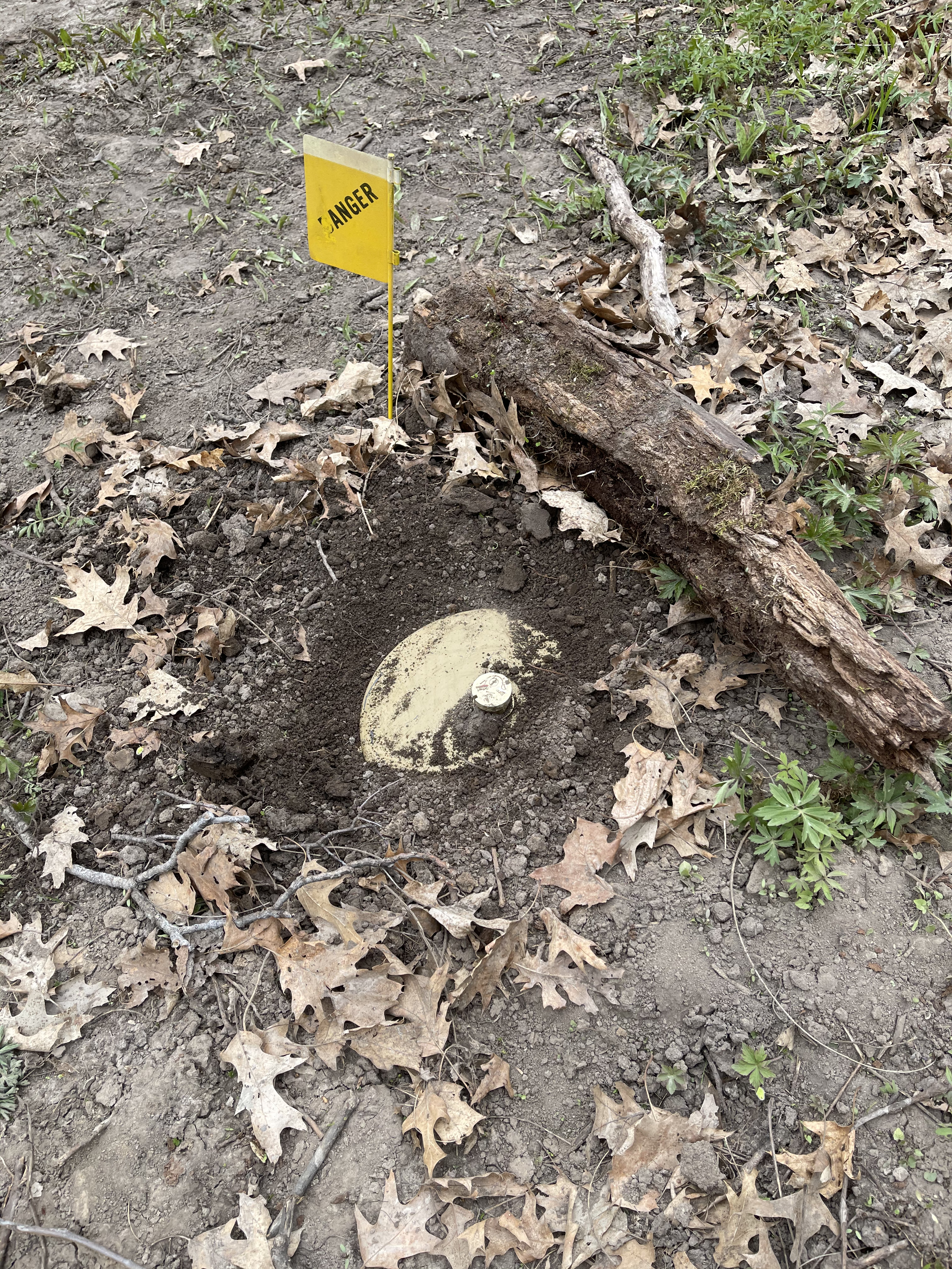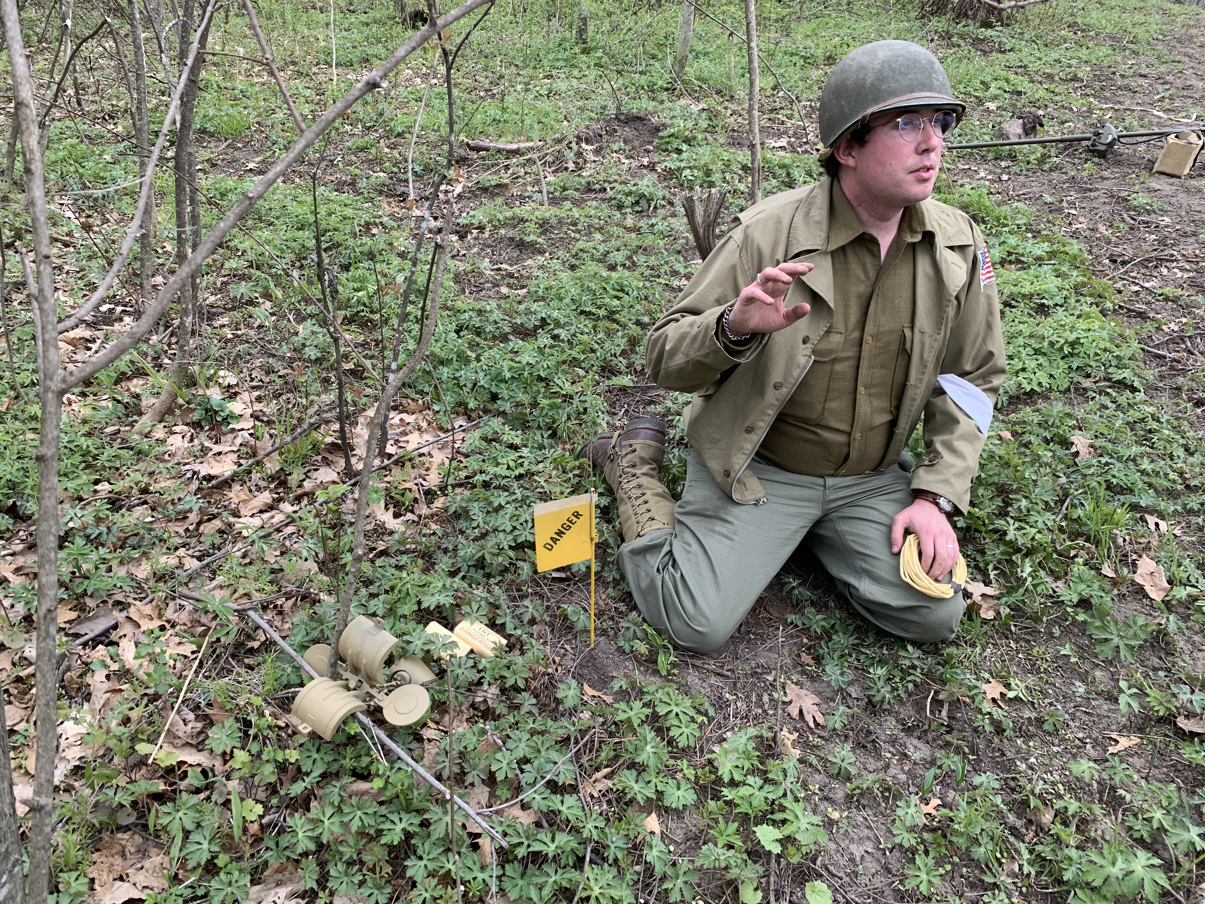 After going through WWII field manuals, unit journals, memoirs, original footage, and interviews, I prepared a minefield reconnaissance exercise based on what the First Engineers would have encountered circa 1943. I set up and camouflaged the four mines and a butterfly bomb seen below: