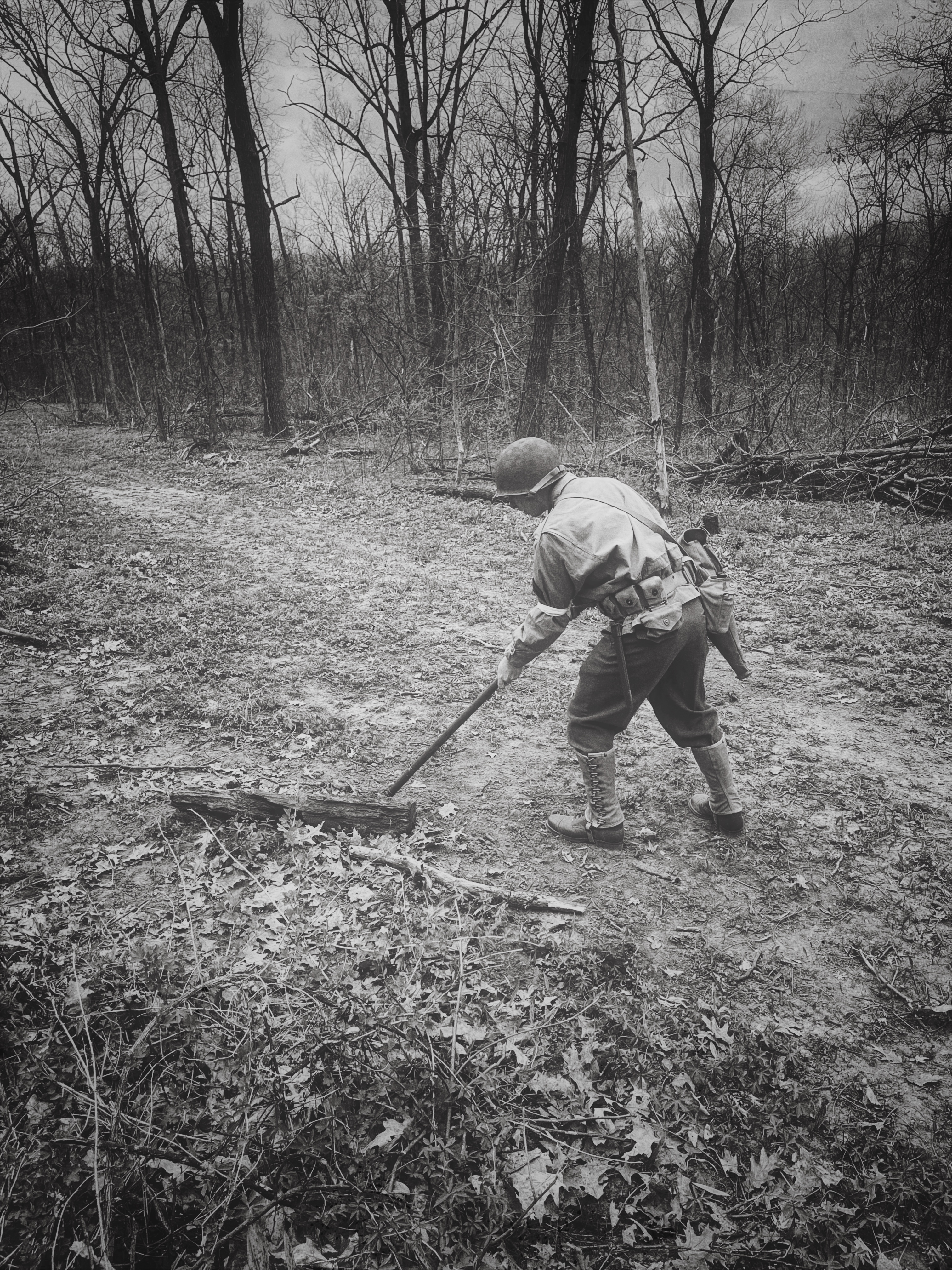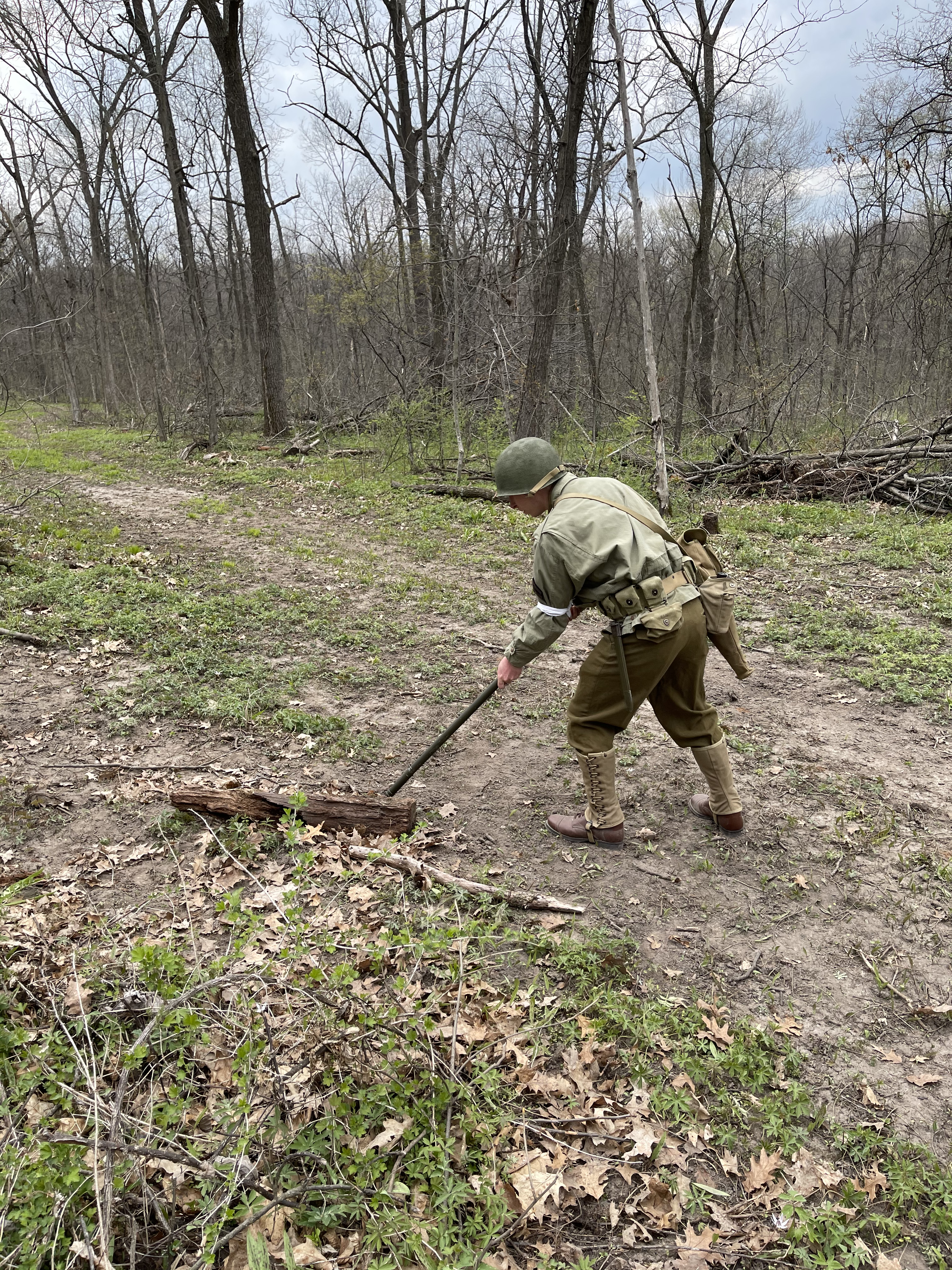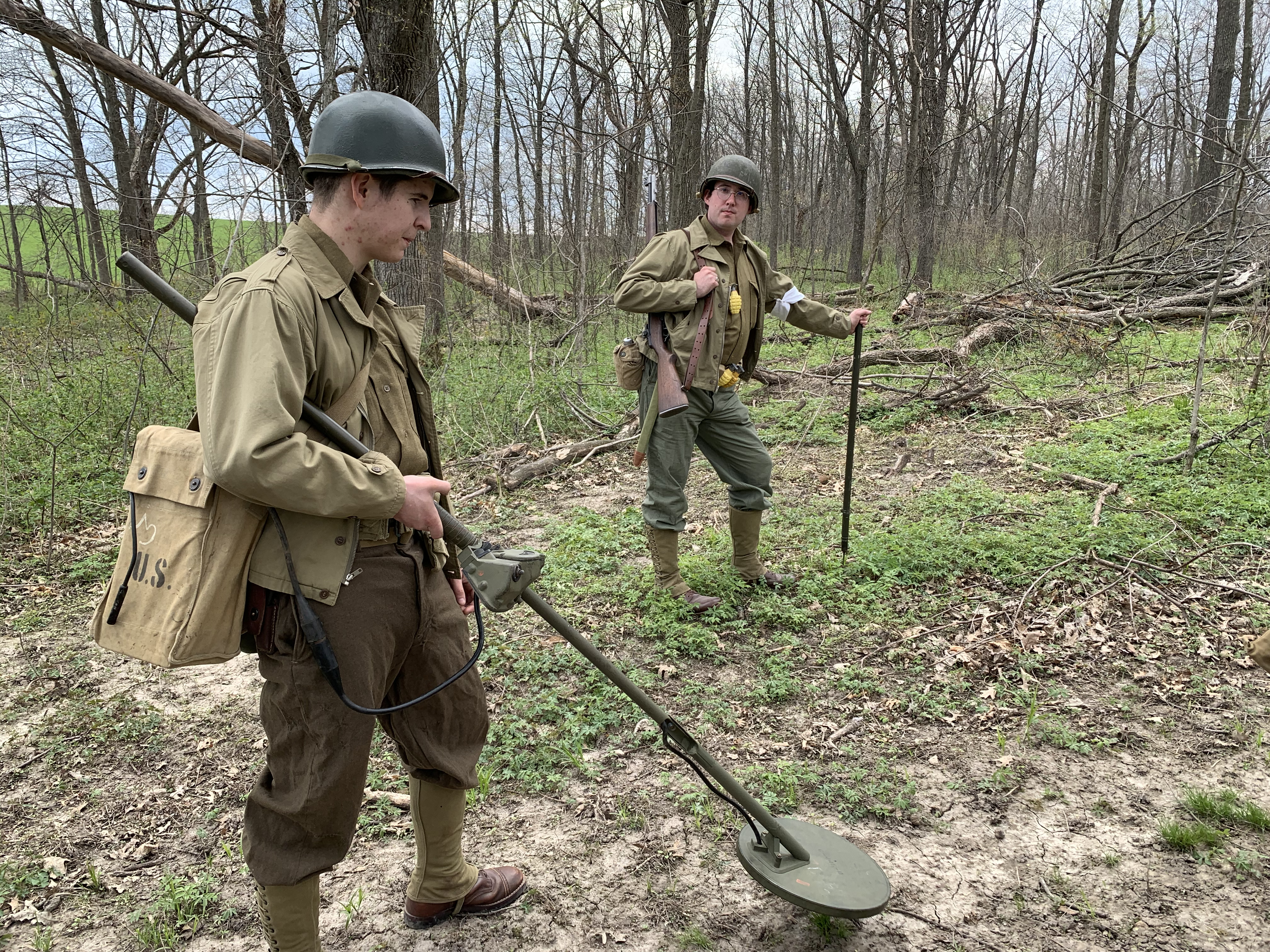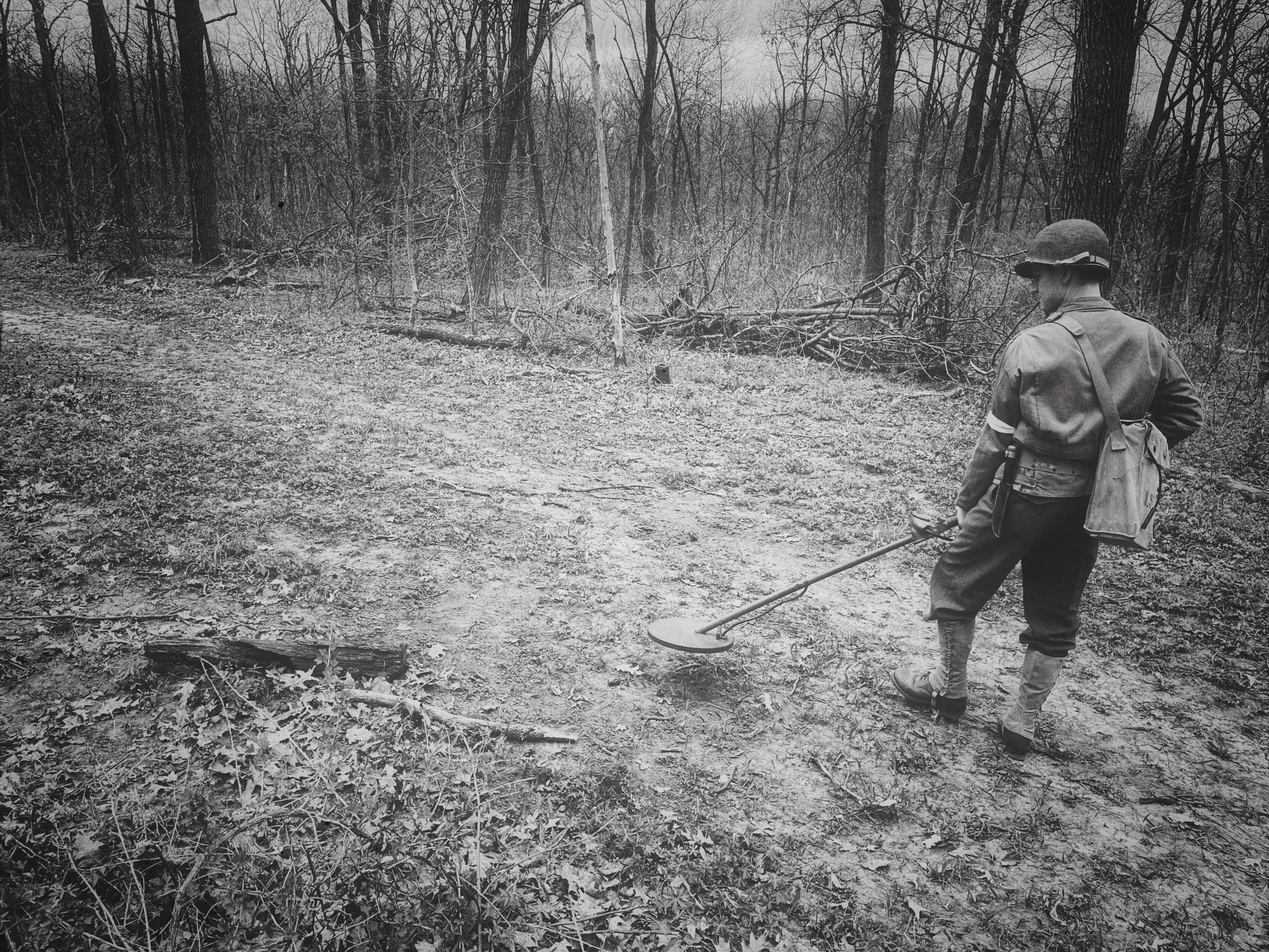 After going through WWII field manuals, unit journals, memoirs, original footage, and interviews, I prepared a minefield reconnaissance exercise based on what the First Engineers would have encountered circa 1943. I set up and camouflaged the four mines and a butterfly bomb seen below: