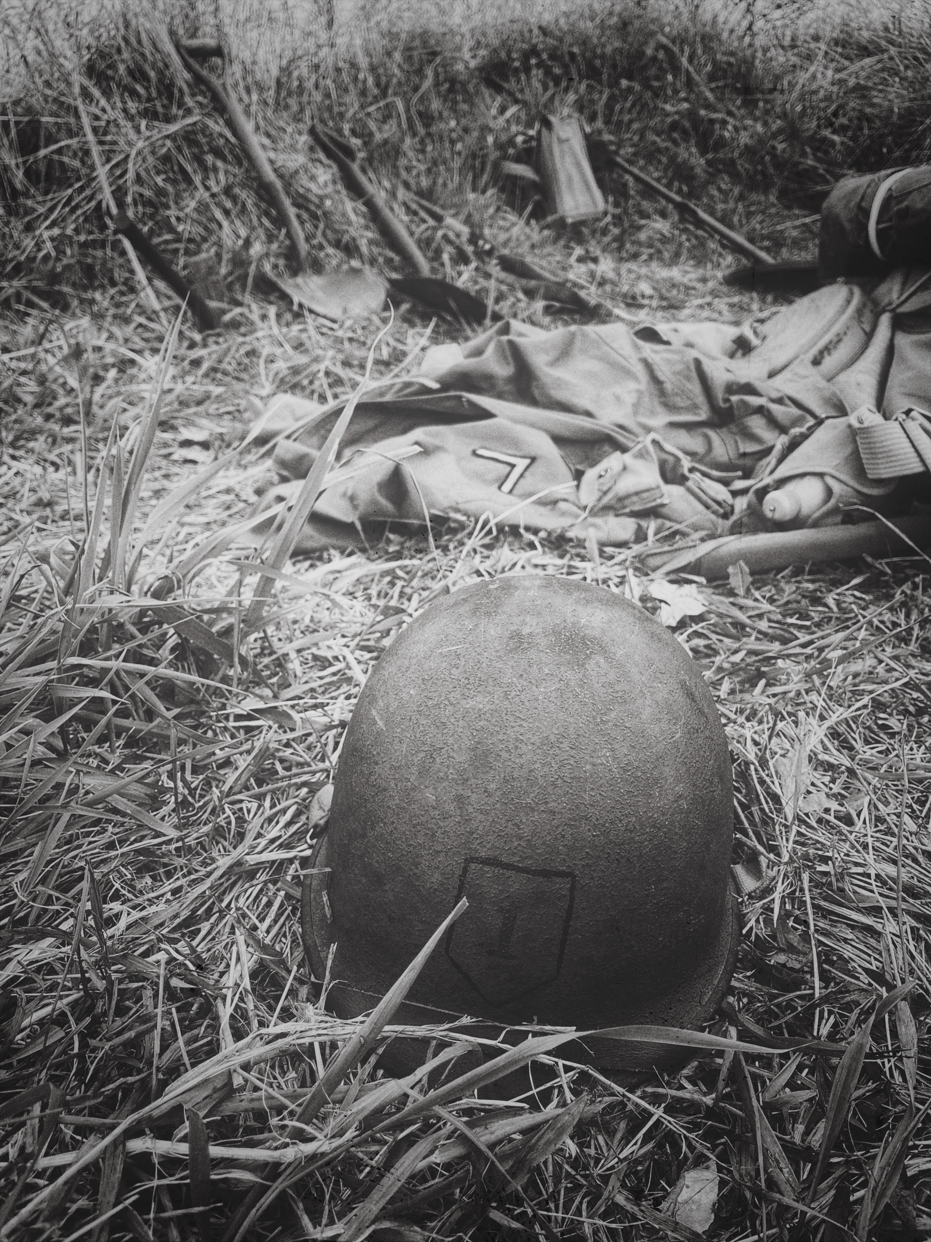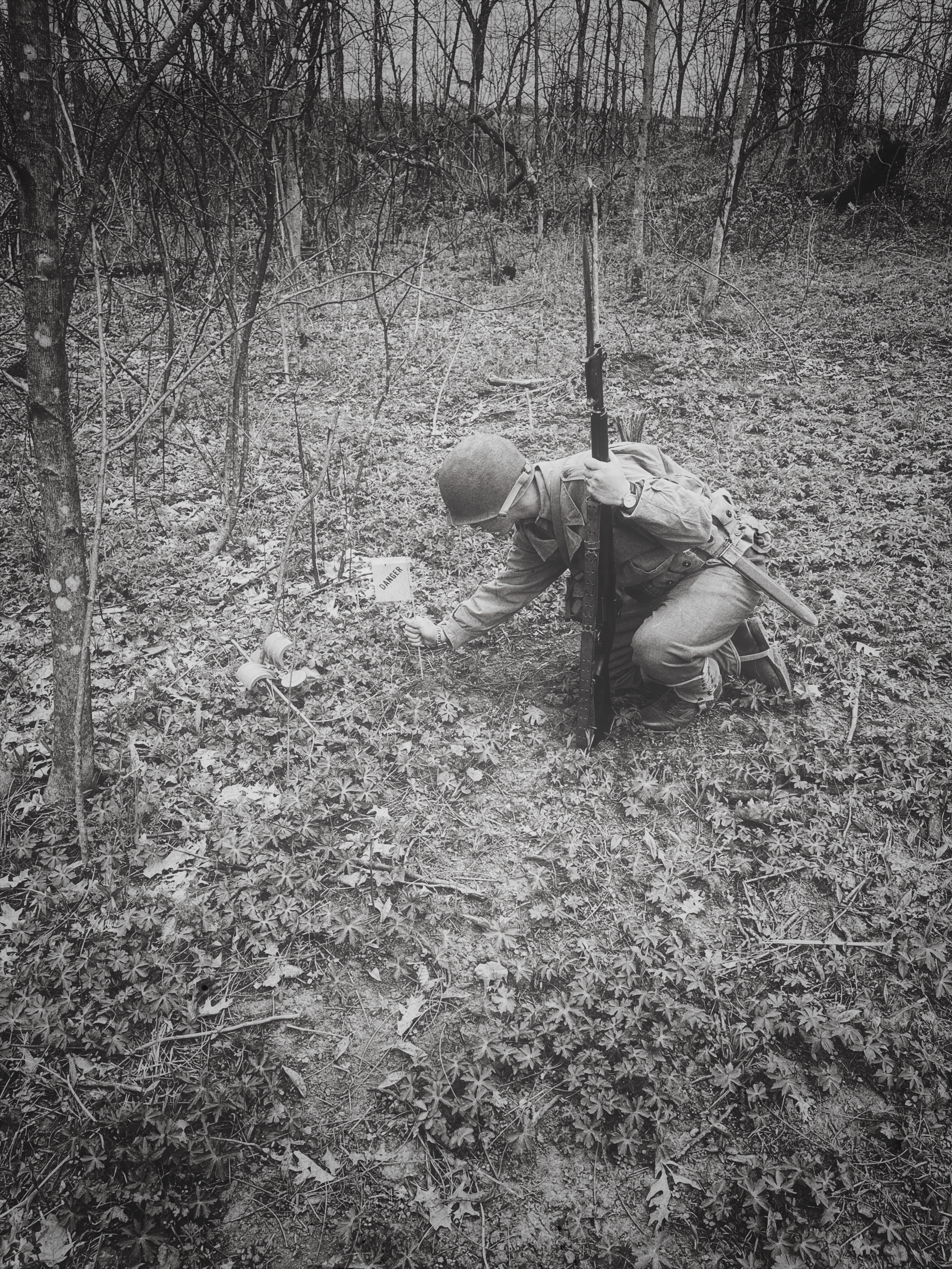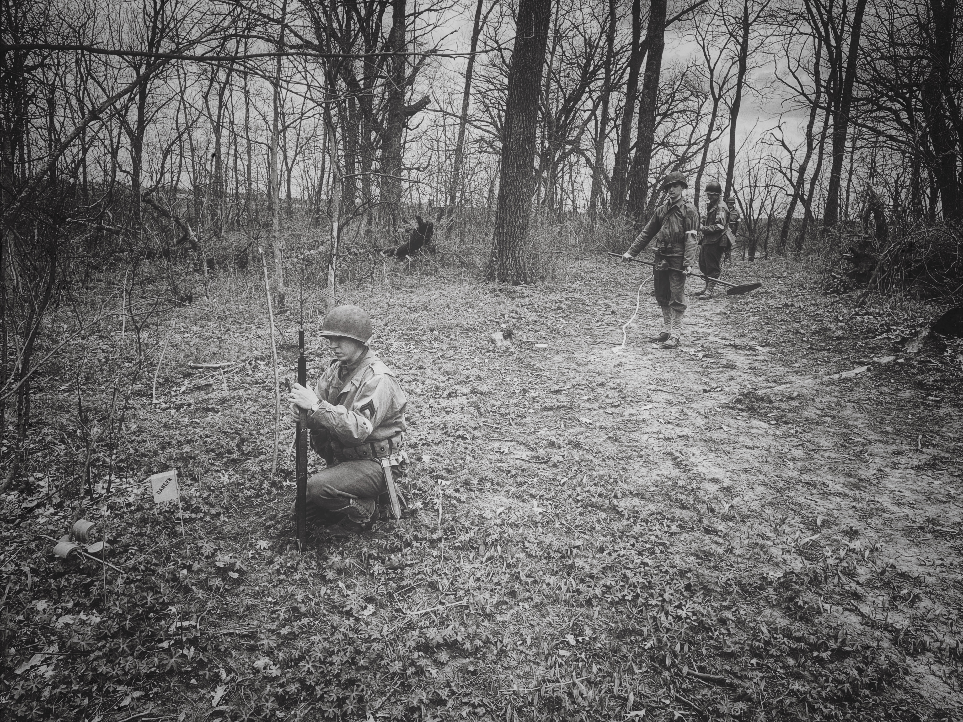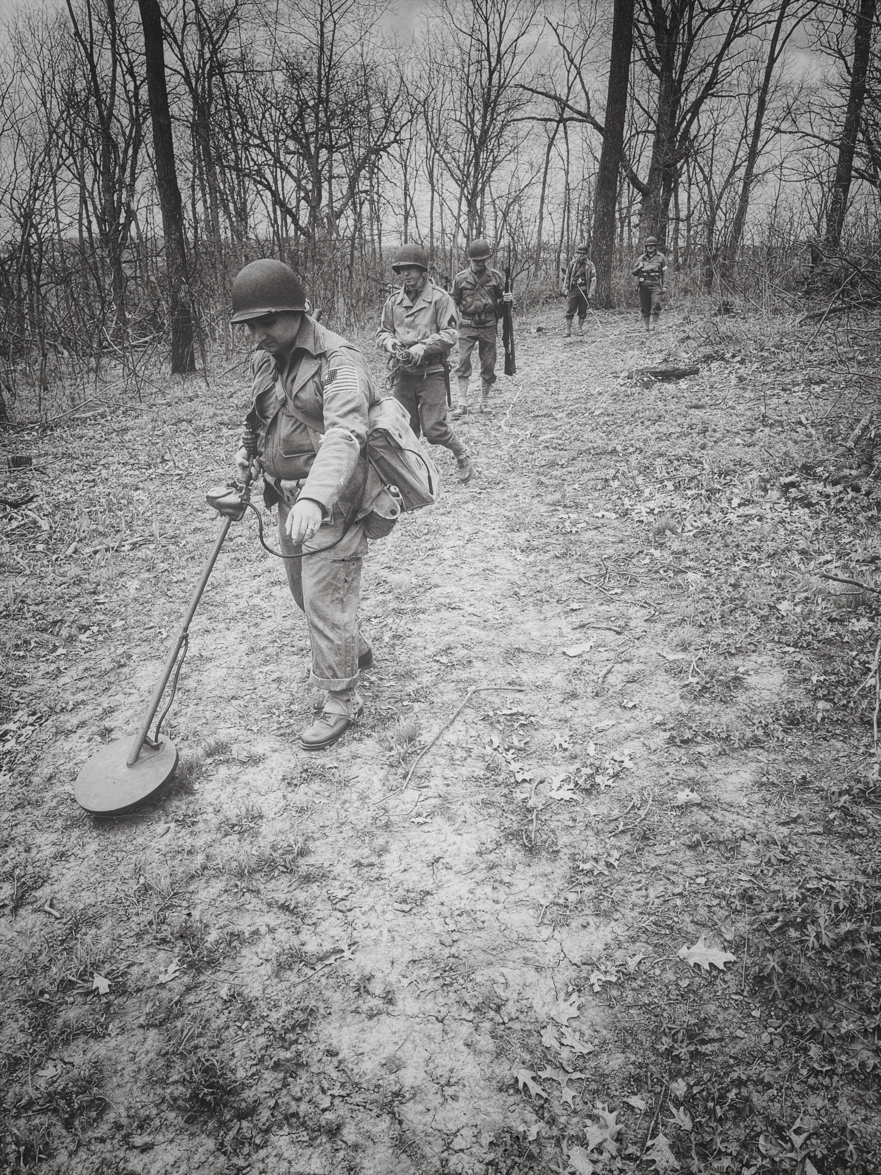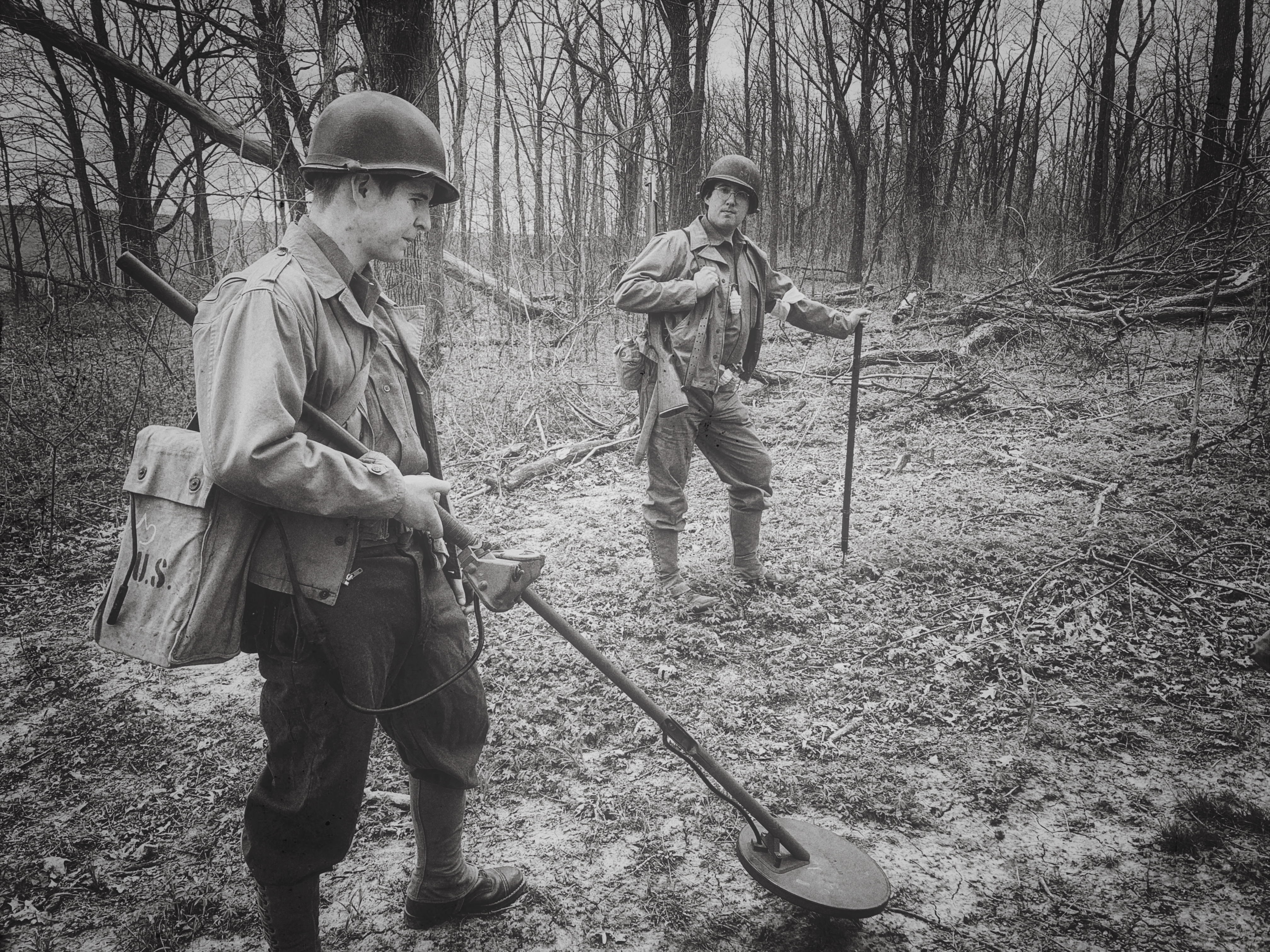 After going through WWII field manuals, unit journals, memoirs, original footage, and interviews, I prepared a minefield reconnaissance exercise based on what the First Engineers would have encountered circa 1943. I set up and camouflaged the four mines and a butterfly bomb seen below: