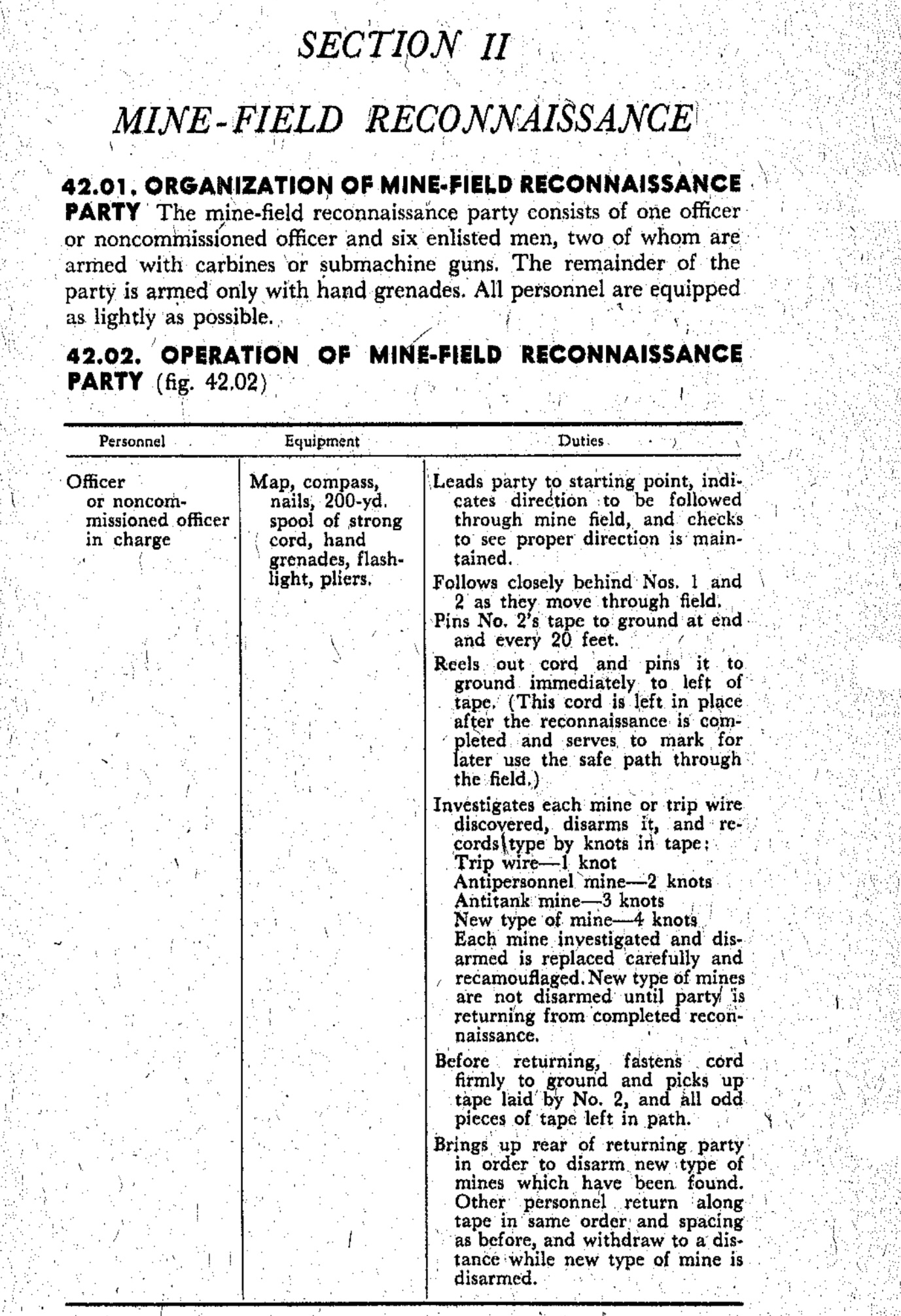 - The Officer or Non-Commissioned Officer (NCO) tied one end of his roll of twine to a stake. The twine marks the center of the safe path through the minefield. If the party finds a mine, he will also tie one knot in the white tape for a trip wire, two for an anti-personnel mine, three for an anti-tank mine, and four for a new type of mine.