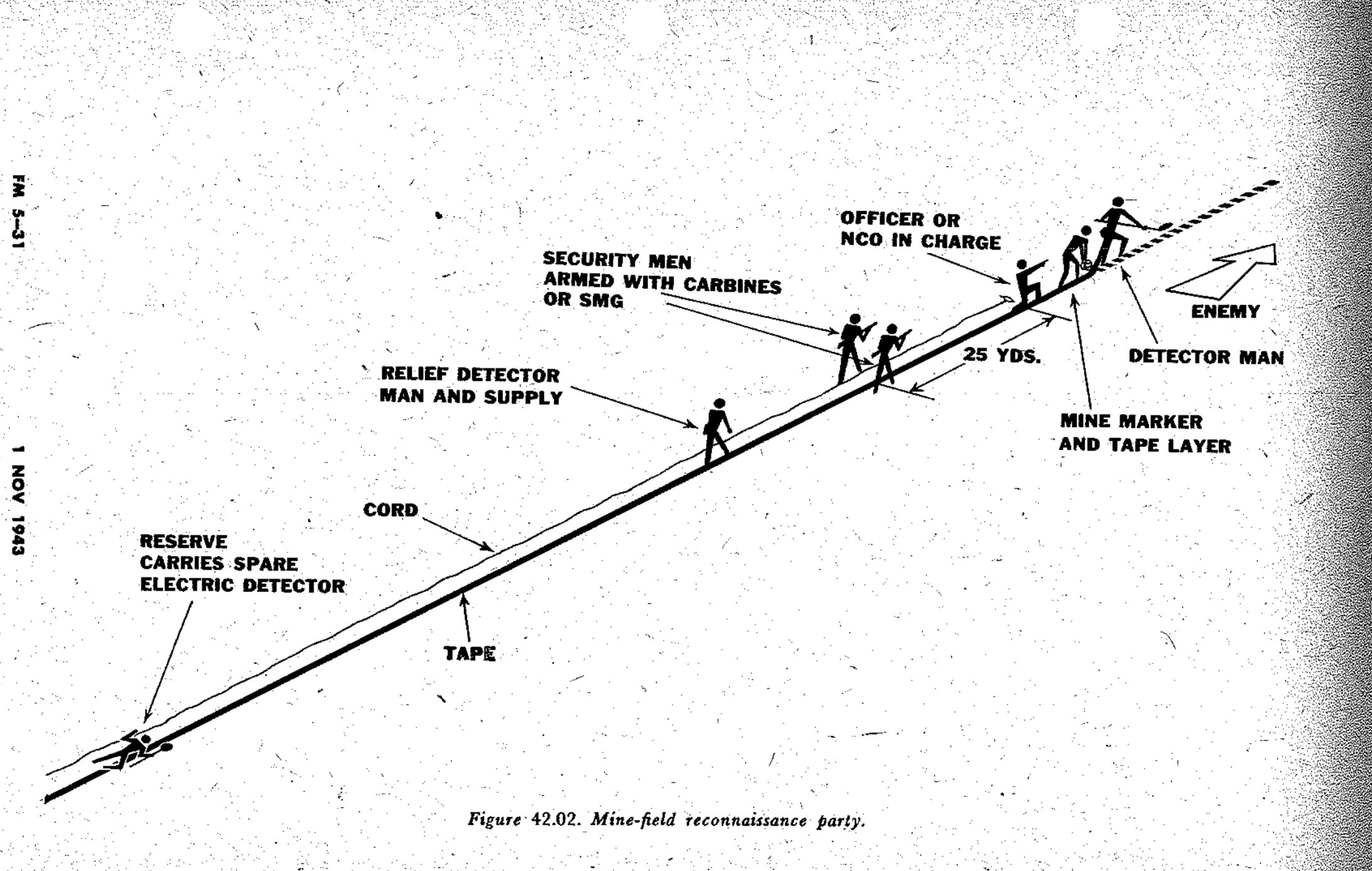- The “No. 3 and No. 4 men” provide security, keeping an eye out for enemy movement and, if necessary, providing covering fire while the patrol retreats. Per FM 5-31, the minefield reconnaissance party armed only with grenades and the No. 3 and No. 4. men’s carbines or submachine guns. As we were switching roles and were also practicing using rifles with bayonets to probe for mines, each man carried a rifle and took turns providing security.