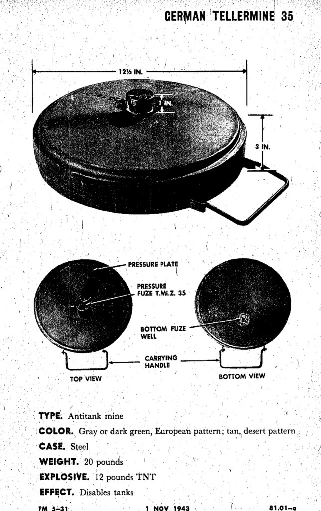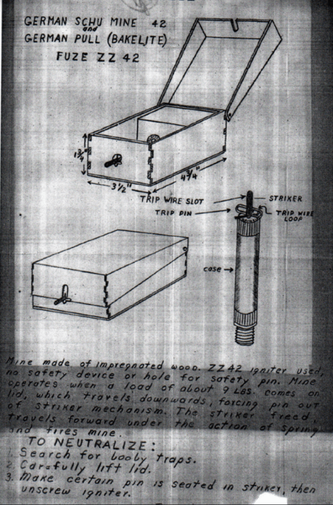 When the First Engineers arrived in North Africa, they were, in general, well prepared for mine warfare. As a regular US Army unit, they were professional soldiers and received far more training than many of the other engineer units that served in the North African, Italian, and European Theater of Operations during the war. One of the key pieces of equipment they had was the SCR-625 Mine Detector which could detect mines containing metal. In response, the Germans began to develop a variety of mines made of wood and glass, as well as come up with a variety of nasty booby traps that would prevent American engineers from relying too closely on these mine detectors. To simulate the discovery of such new mines, I only trained my squad on the Stock Mine, the Tellermine, and the S-Mine (better known as the Bouncing Betty) and told them to use their best judgement in finding and disarming the other mines they would encounter.