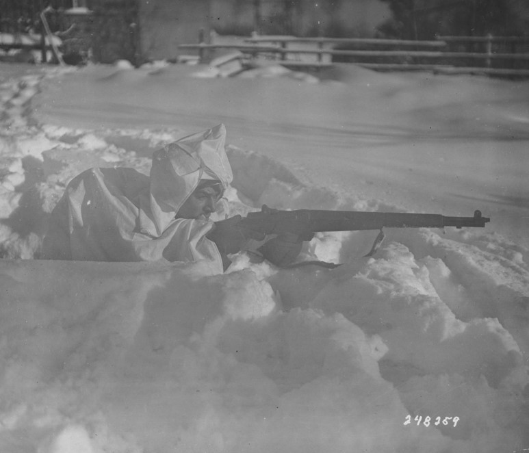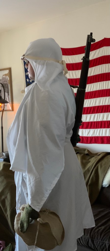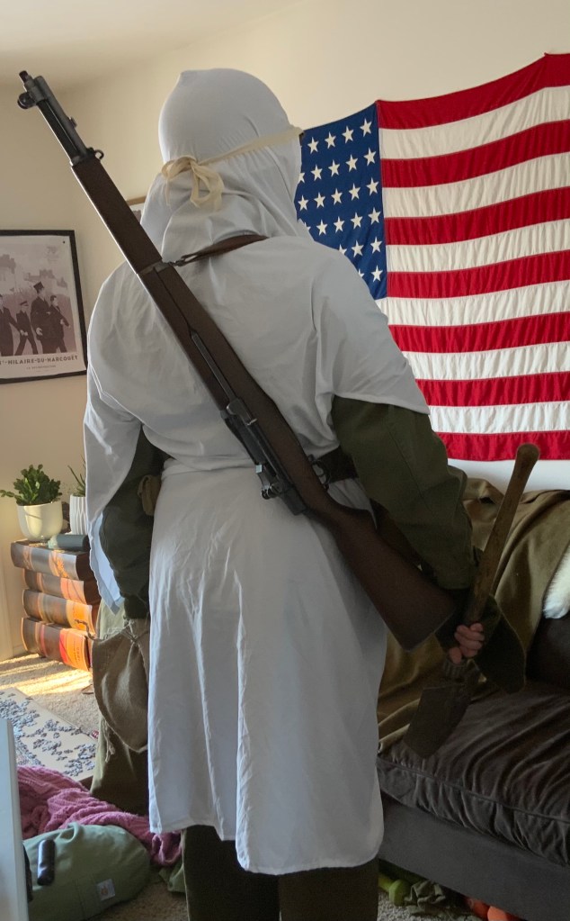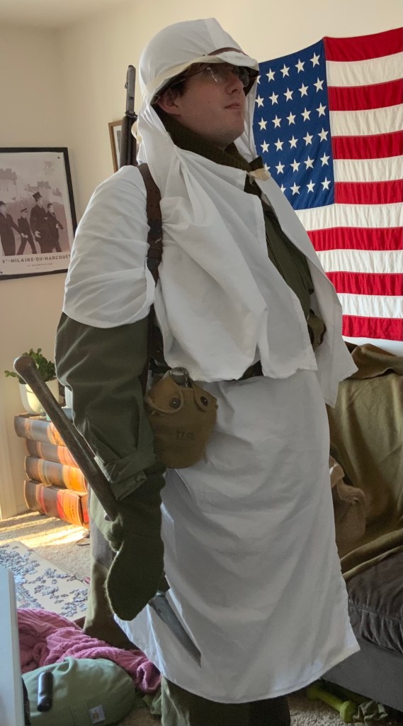 Based on a pattern that appears to be similar to what the 1st Infantry Division was wearing and the 100th Infantry Division (Reenacted)’s excellent post about the production of snowcapes, I set out to reproduce one (with much incredible help from my fiancée). I bought a set of white sheets from Target and then after quite a bit of head scratching, we cut out the pattern based on how we interpreted the instructions. My fiancée also helped me fix the hood to look more like the original photos (and to remove the… unfortunate implications of the pointed hood).