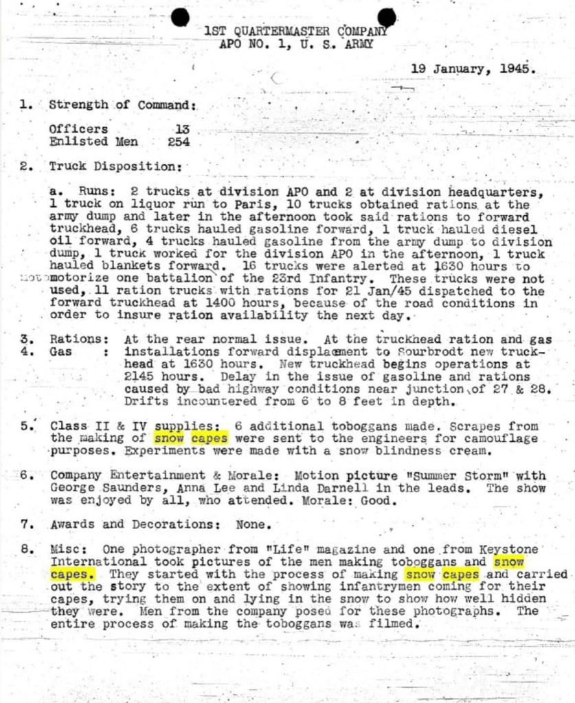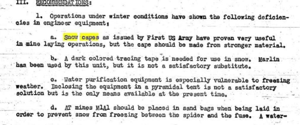 As I was digging through the 1st Engineer Combat Battalion archives, I discovered that the combat engineers used snowcapes fairly extensively during the Battle of the Bulge, especially when laying minefields.