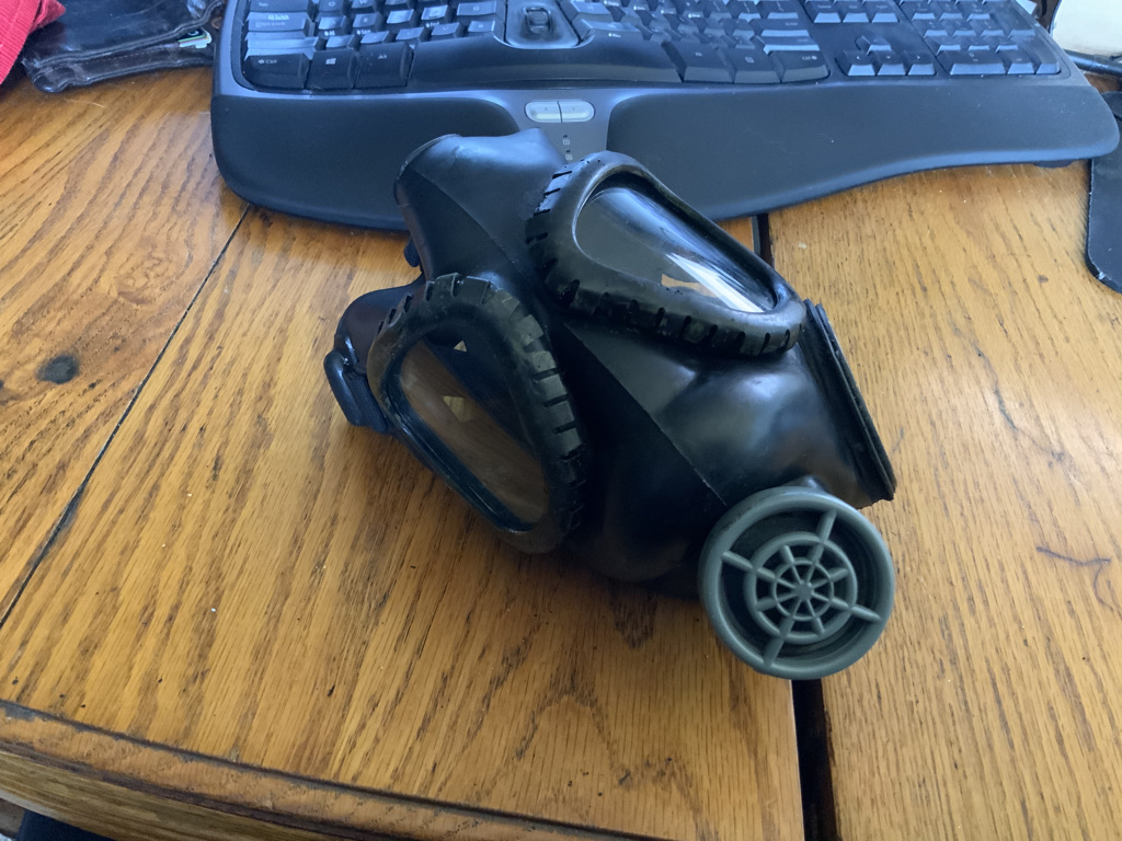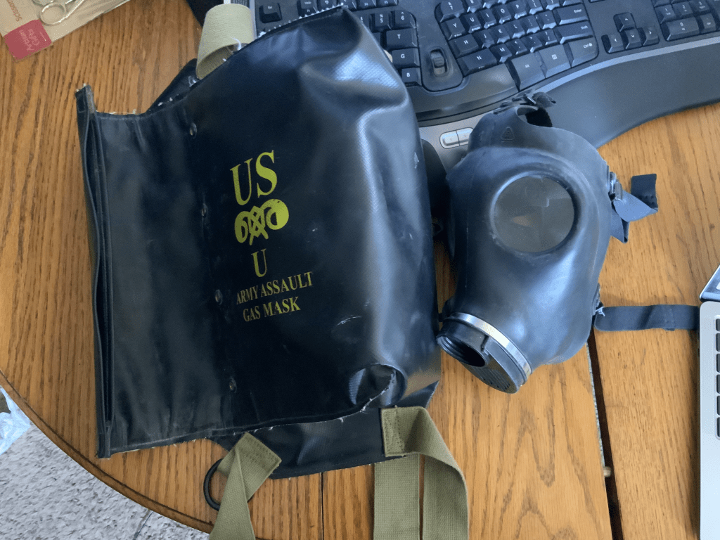 Based on my previous research, I knew that this bag would have contained the E6-3-7 Army Assault Mask (often called the M5 by reenactors) , but these are often sold for hundreds of dollars and I didn’t want to spend that sort of money on this.