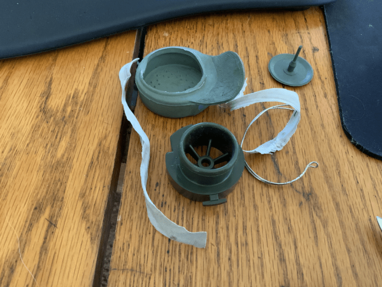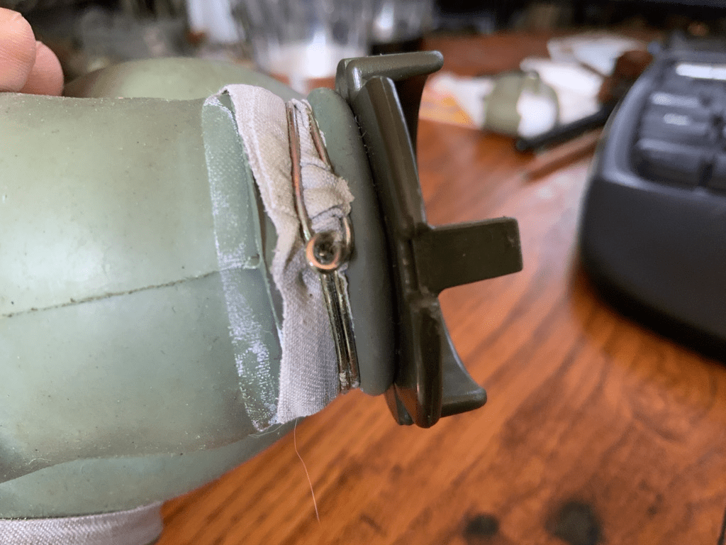 Once I was satisfied by how it looked and it was dry, I was able to add the eyepieces back on. I put some rubber cement on the ring of the WWII outlet valve, put it in the appropriate hole, and wrapped it with black friction tape.